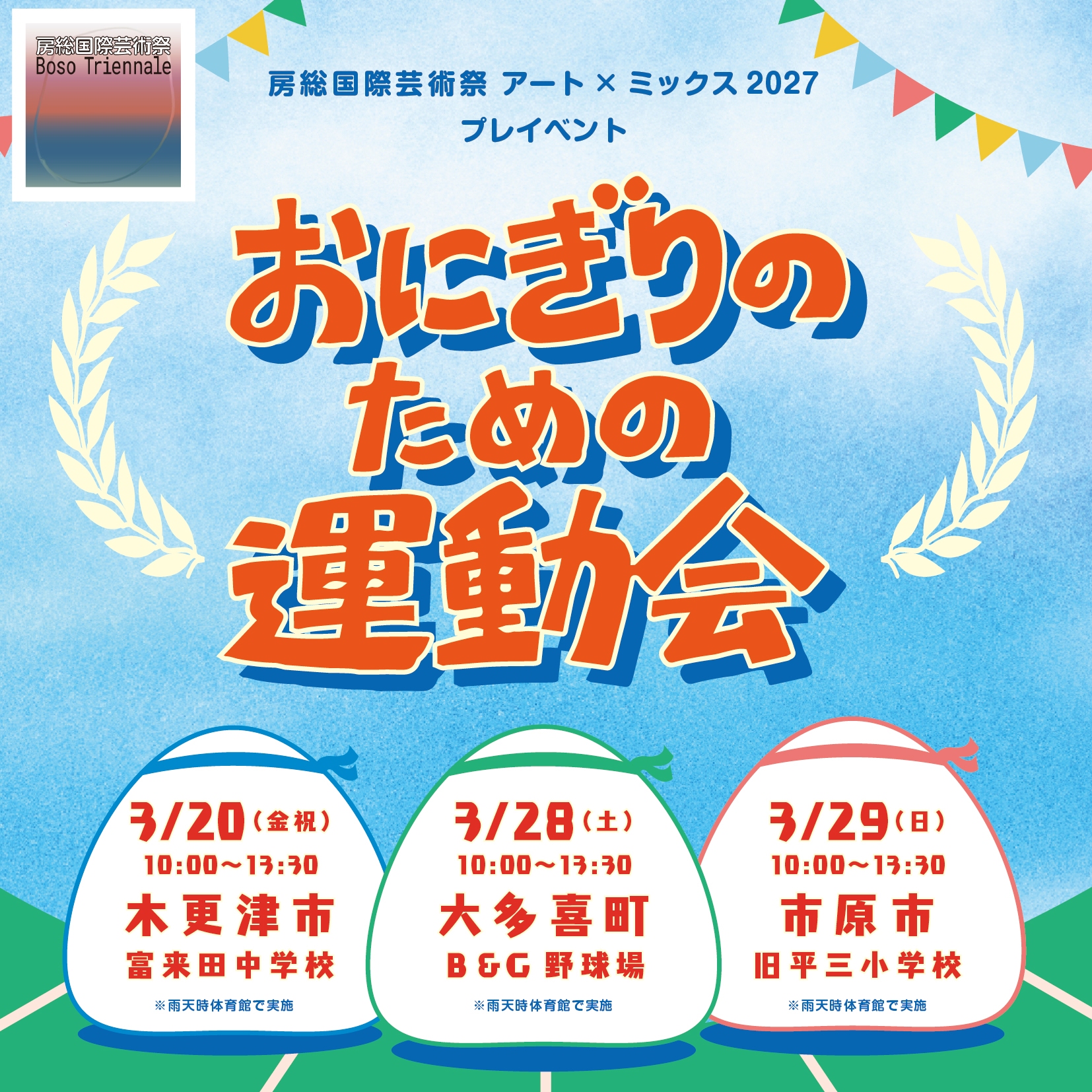 おにぎりのための運動会2026 ICHIHARA ART FIELD 2026.02.16 2026年3月 おにぎりのための運動会を開催します。3月20日(金)木更津市富久田中学校/3月28日(土)大多喜町B&G野球場/市原市旧平三小学校 申し込みは3月1日(日)房総国際芸術祭 アート×ミックス公式サイトから